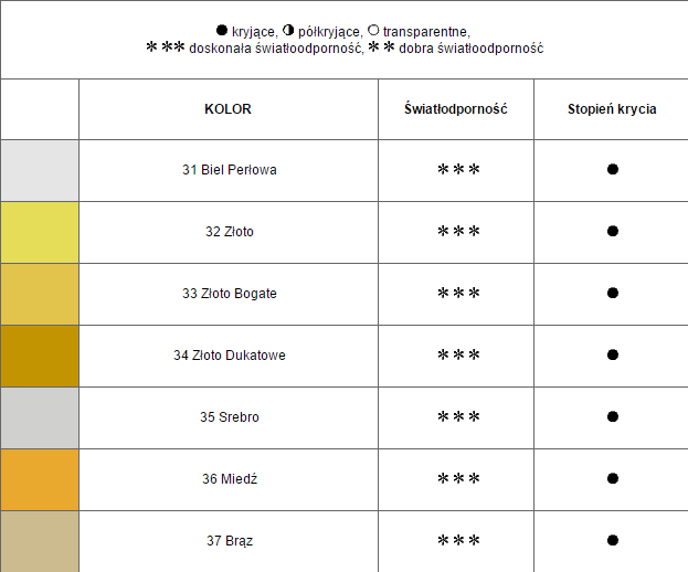 31-biel perłowa, 32-złoto, 33-złoto bogate, 34-złoto dukatowe, 35-srebro, 36-miedź i 37-brąz.